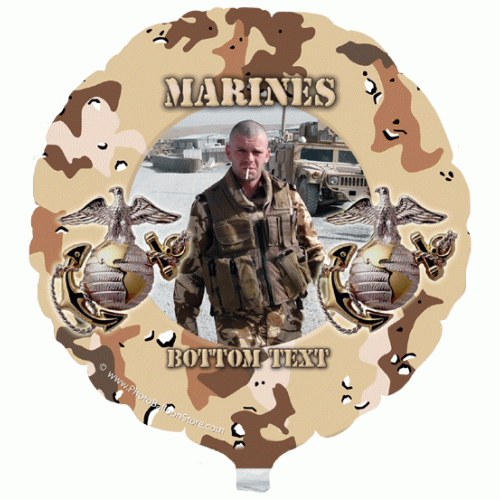 Featuring a desert camouflage design accented with Eagle, Globe, and Anchor emblems, this personalized balloon is a proud salute to those who serve. Add your custom photo and text to make it a heartfelt tribute for active-duty Marines, veterans, or family celebrations.